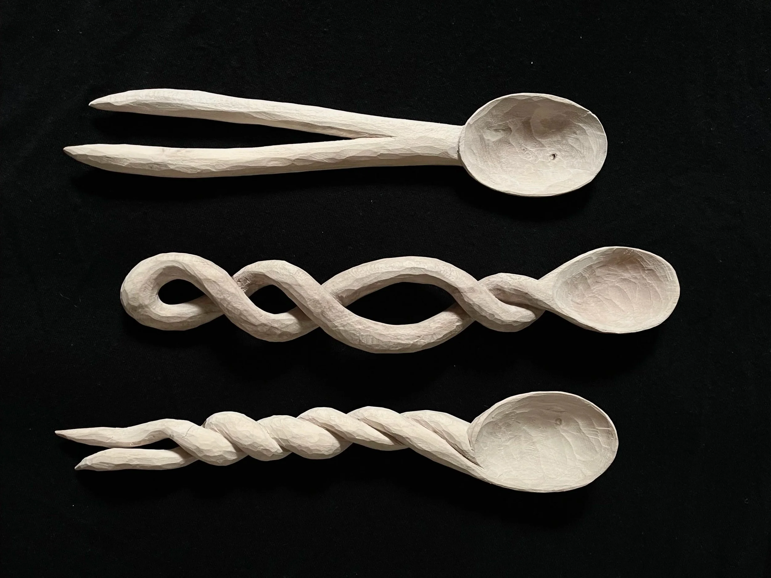 As a child I would whittle whenever I could, first with my dad’s leatherman and eventually my own knife, carving magic wands and small creatures out of driftwood and sticks found in campsites. I made my first spoon when I was 12, and for many years that was my only spoon. I stopped carving for the most part, and moved on to painting and pottery, until a few years ago when I visited a family friend on the Isles of Scilly. He reintroduced me to carving, suggesting I try a spoon. Since then, I have been making spoons whenever I can get my hands on any green wood (city living doesn’t lend itself to this). I often make them in phases, and they naturally form into families.